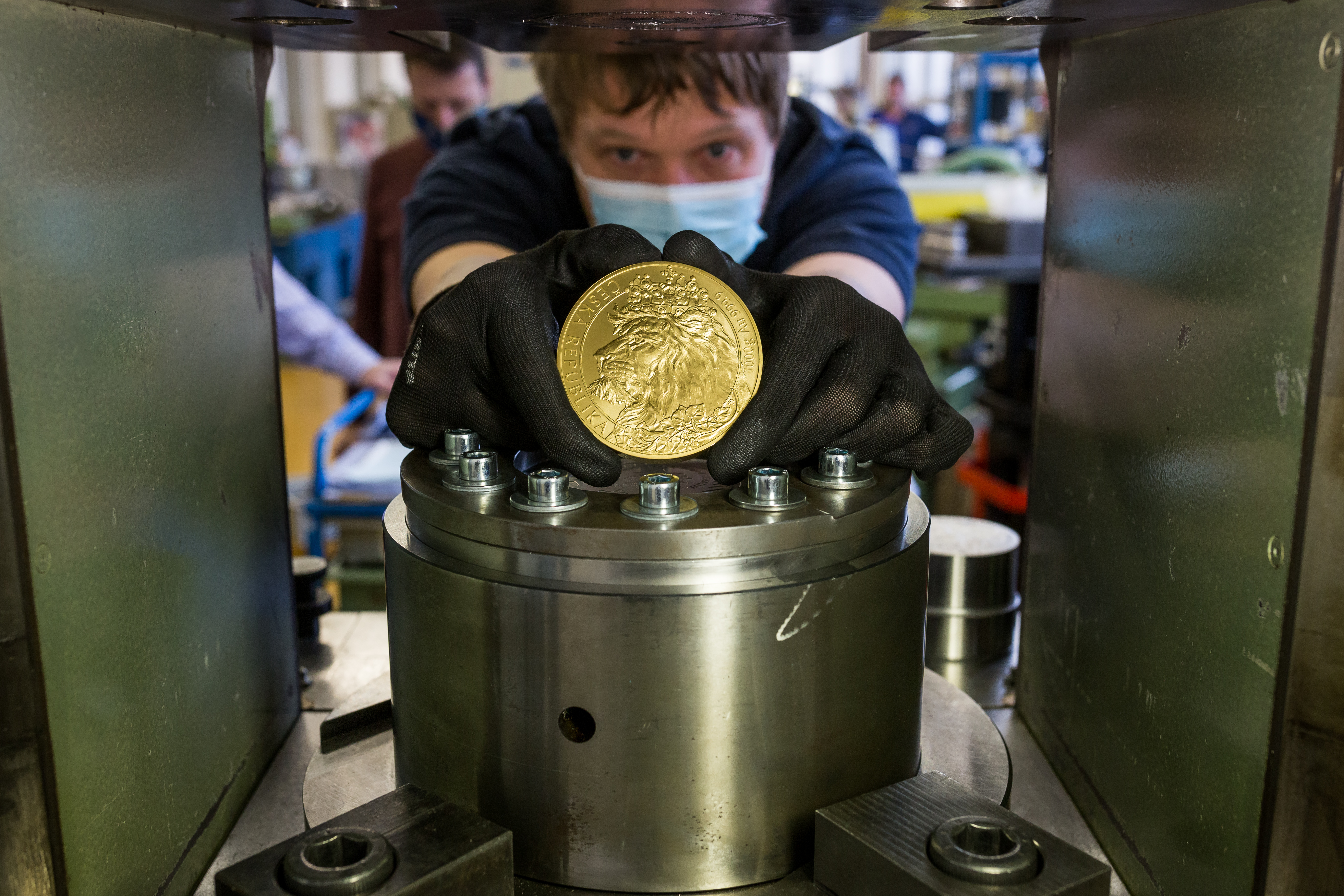 Zlatá mince s nominální hodnotou 100 000 000 korun pro ČNB ke stoletému výročí československé koruny. Na výrobě mince o váze 130 kilogramů ryzího zlata se podílely tři firmy. Závěrečné povrchové a rytecké úpravy byly svěřeny České mincovně, kde si vyžádaly 550 hodin práce. Na snímku rytci Mária Filová a Jaroslav Hrach.