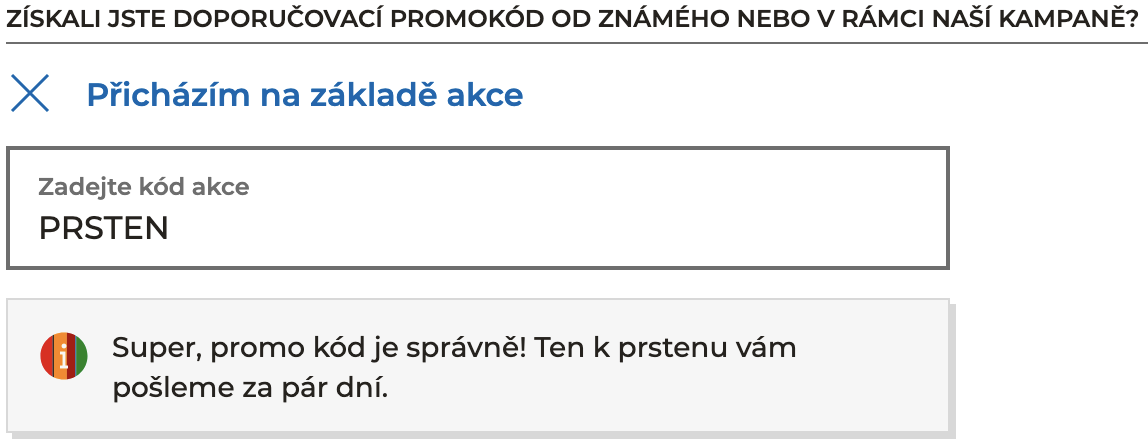- Při zakládání účtu napište kód „PRSTEN“ do určeného políčka.